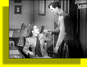 Noel Neill is a sweeter Lois Lane, whom she first plays in the two 15-chapter movie serials in 1948 and 1950. Here she is with Kirk Alyn in a scene from chapter 6 of the first serial SUPERMAN. (Thirty years later, both are cast in brief cameos as the train passenger parents of an adolescent Lois Lane during the Smallville sequence of Superman: the Movie as young Clark runs home from school. Alyn is out of frame in the film's final cut, but Neill is clearly evident.) |