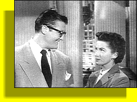 Phyllis Coates stars as Lois Lane in the first twenty-six dramatic episodes of The Adventures of Superman TV series, which first airs in 1951. Her Lois is tougher than Noel Neill's. In this scene with George Reeves from the first episode, "Superman on Earth," Clark Kent has just been hired after "scooping" the more experienced Daily Planet reporter, Lois, in the paper's first story about Metropolis's new hero, Superman. (In 1994 Ms. Coates is cast as Lois's mother for the Lois & Clark first season finale episode about Lois's almost marriage to Lex Luthor.) |